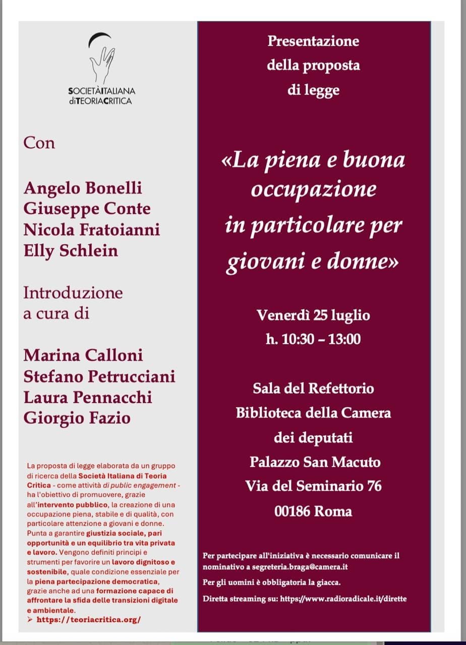Il progetto di ricerca e di public engagement «La piena e buona occupazione, in particolare per giovani e donne» – promosso dalla Società Italiana di Teoria Critica, presieduta dalla prof.ssa Marina Calloni – sarà presentato il 25 luglio presso la Biblioteca della Camera dei deputati, con la partecipazione di: Angelo Bonelli, Giuseppe Conte, Nicola Fratoianni, Elly Schlein.