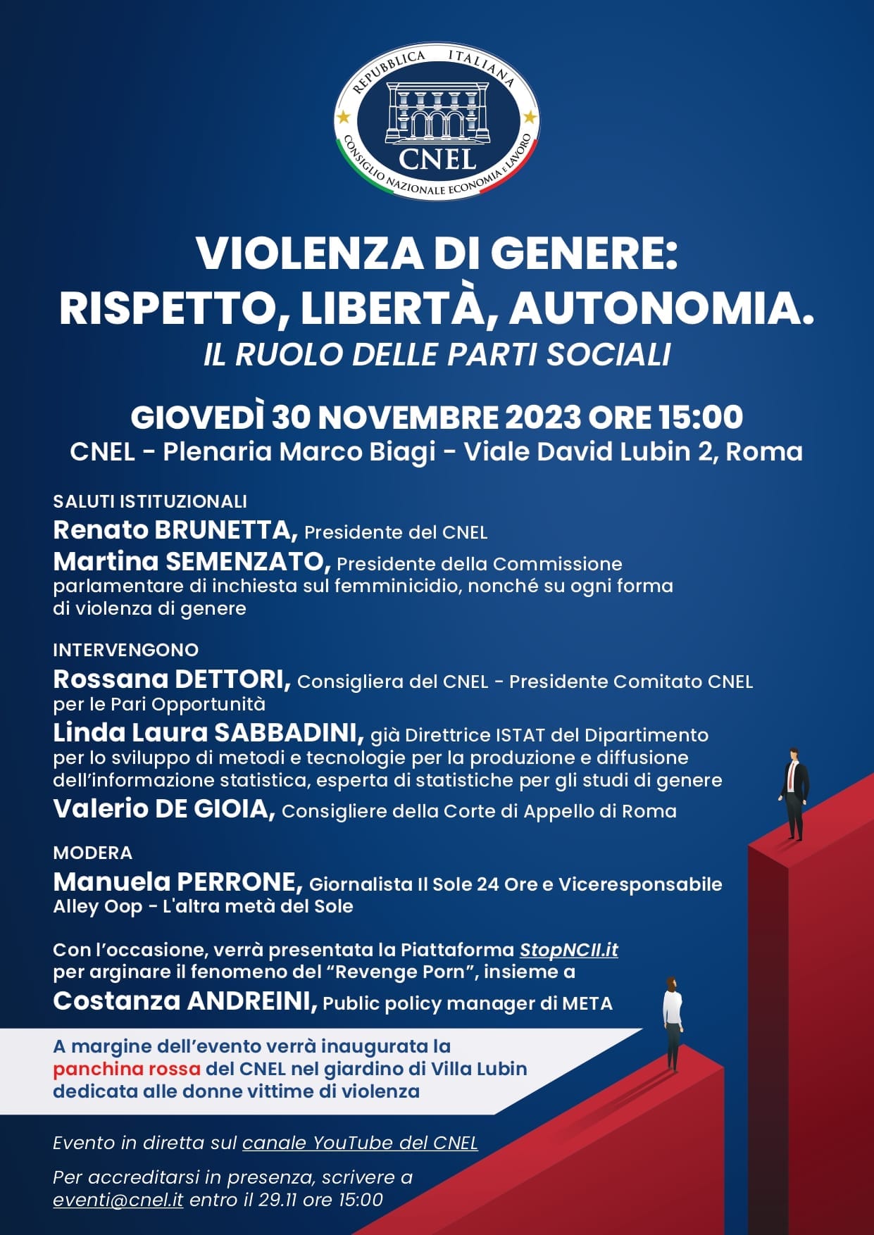 Il convegno si aprirà con i saluti istituzionali del presidente del CNEL, Renato Brunetta, e della presidente della Commissione parlamentare d’inchiesta sul femminicidio nonché su ogni altra forma di violenza di genere, Martina Semenzato.