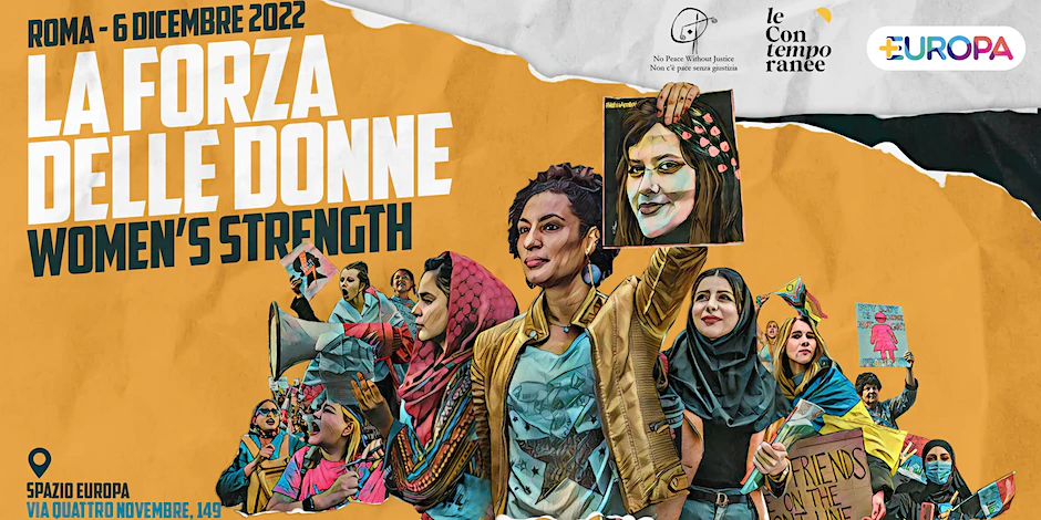 Emma Bonino, insieme a Non c’è Pace Senza Giustizia e Le Contemporanee, con il supporto di +Europa, organizzano l’evento “La Forza delle Donne”, che si terrà il 6 dicembre 2022 allo Spazio Europa a Roma, via Quattro Novembre 149, per sostenere, alla vigilia della giornata dei Diritti Umani, le lotte, il coraggio e la determinazione delle donne che scendono in piazza e si battono per i loro diritti, per quelli delle future generazioni e per i diritti umani di tutti.