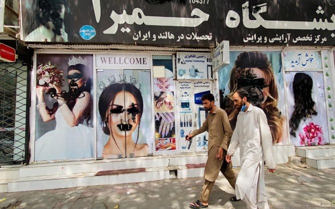 Le vetrine di parrucchieri e centri estetici, ormai destinati alla chiusura, venivano ormai da tempo vandalizzate dai miliziani, nell’ennesimo sforzo di cancellare la donna; addirittura, a partire dalla sua rappresentazione.